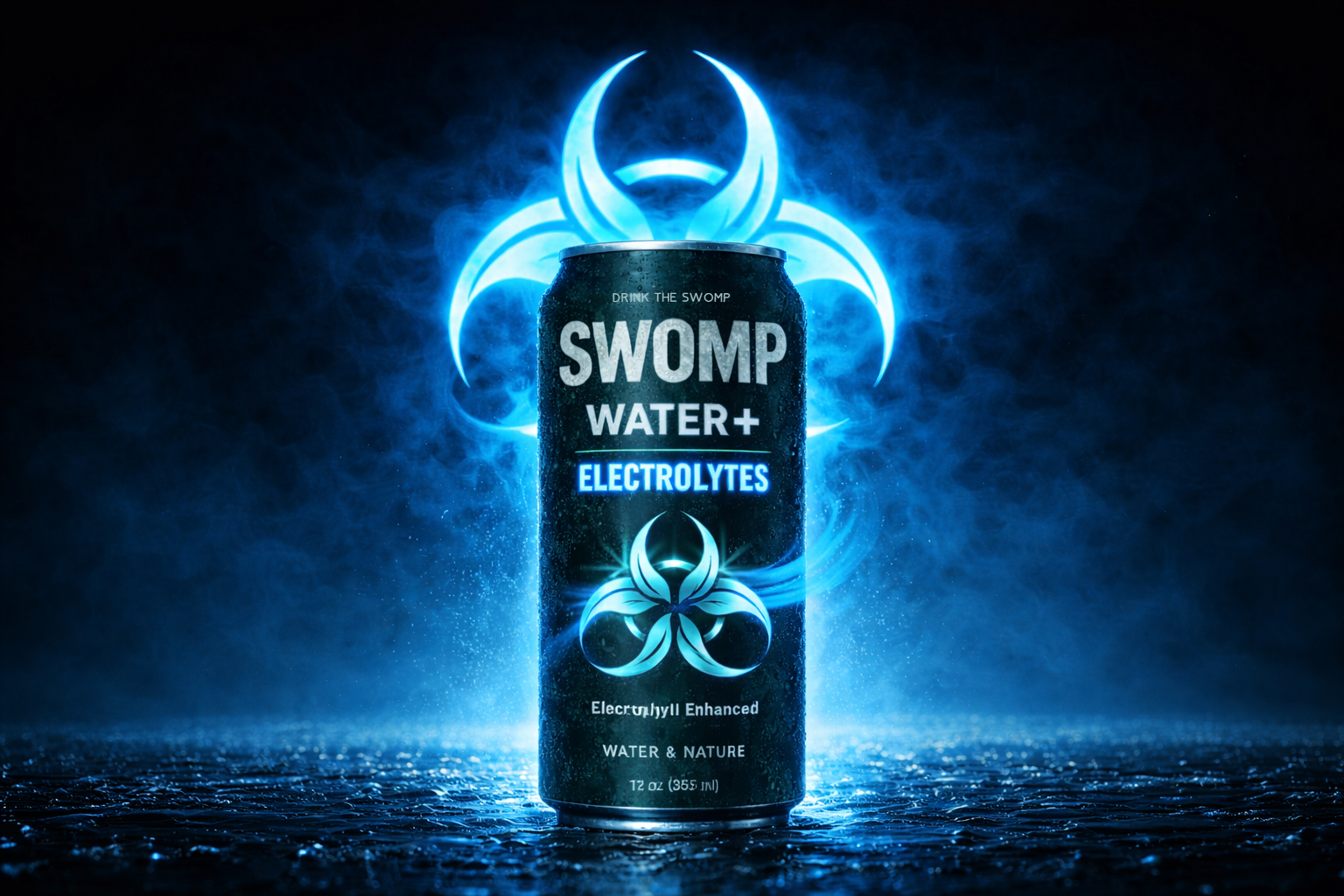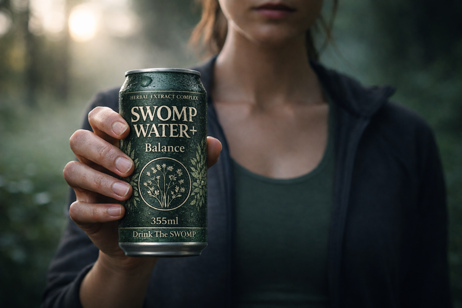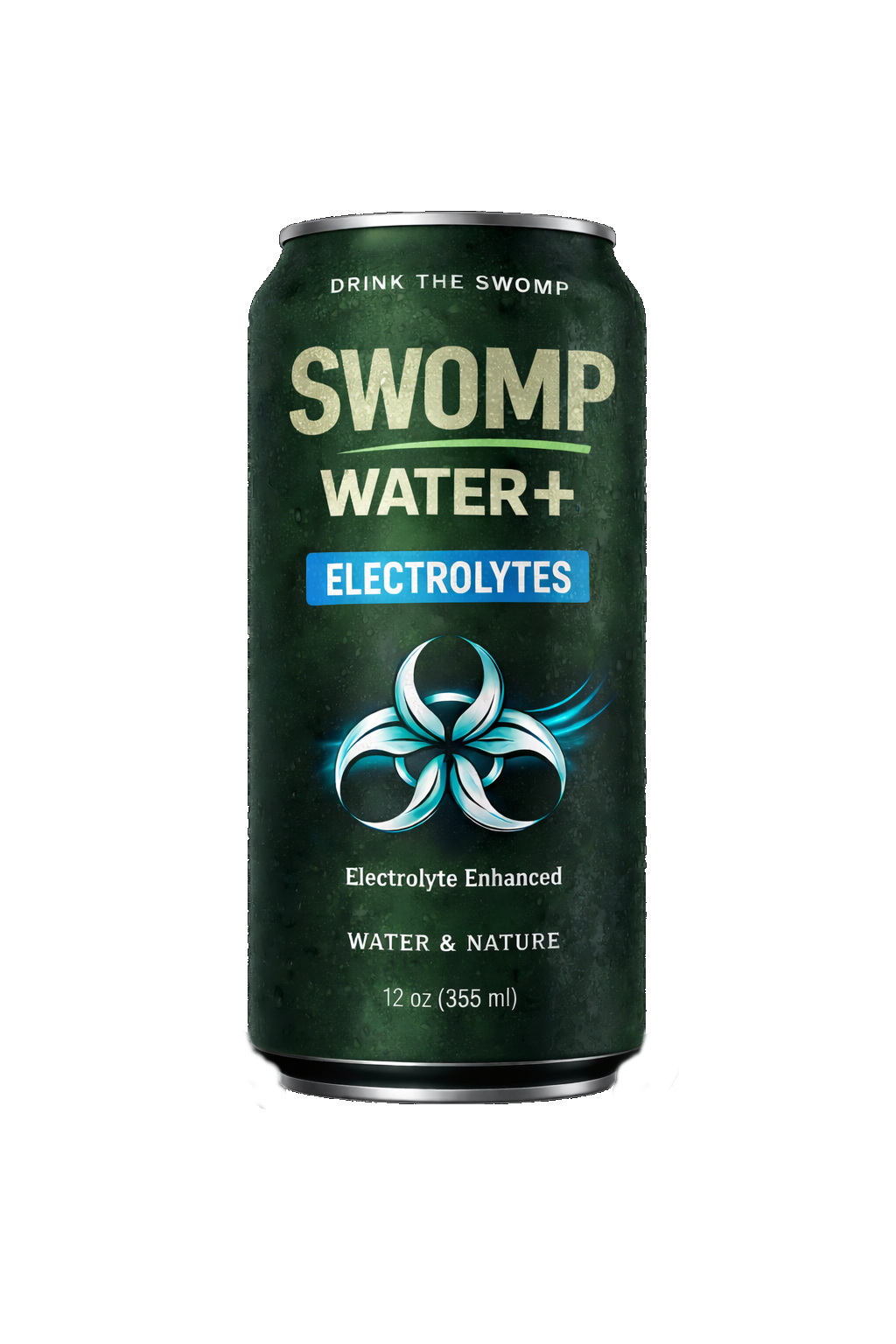 Design an original artwork for the back panel of a SWOMP WATER+ electrolyte water can. The artwork should feel fresh, natural, and energetic â capturing the SWOMP brand spirit.